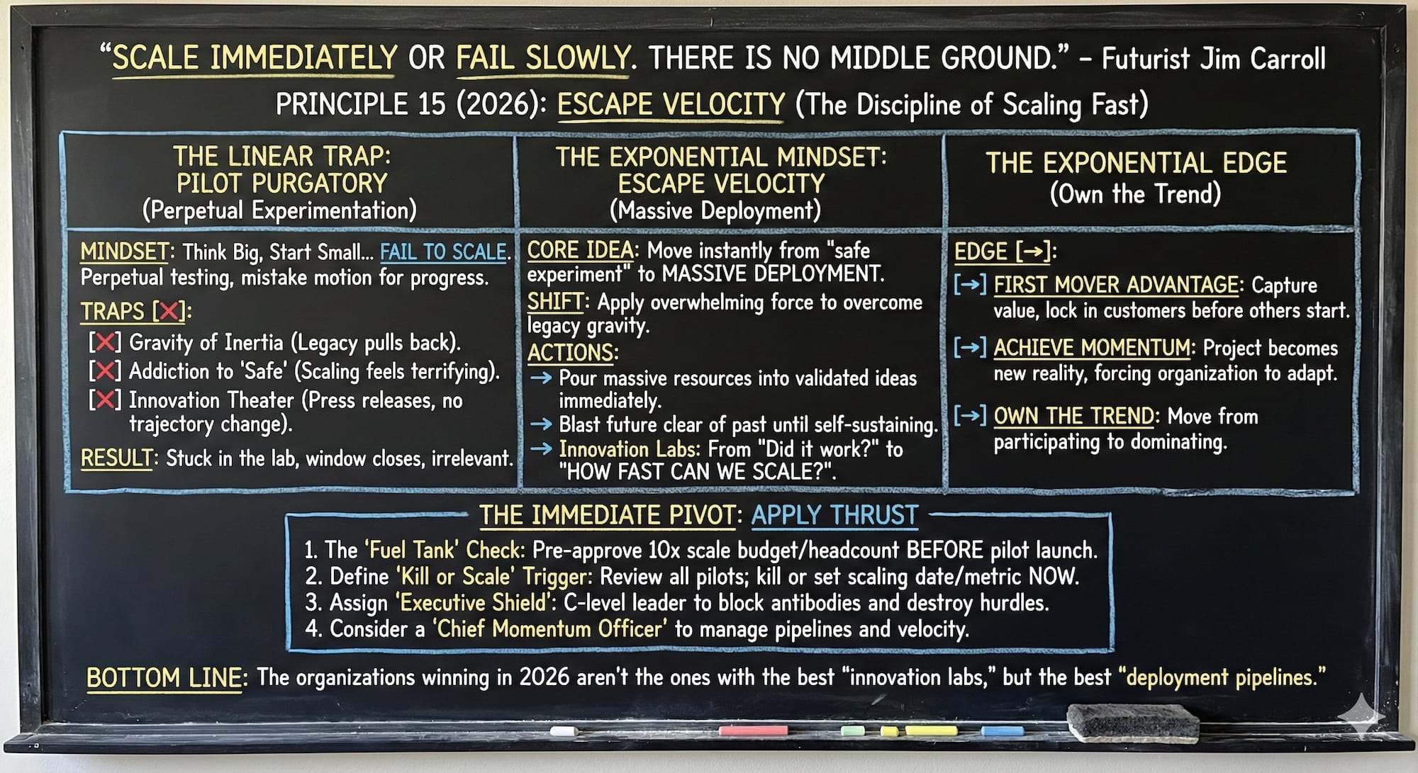 - The "Fuel Tank" Check: Before approving any new "Start Small" pilot, demand to see the scale plan. If the pilot hits its metrics in 90 days, exactly how much budget and headcount is pre-approved to release on Day 91 to scale it 10x? If there is no fuel in the tank for scaling, do not launch the rocket.