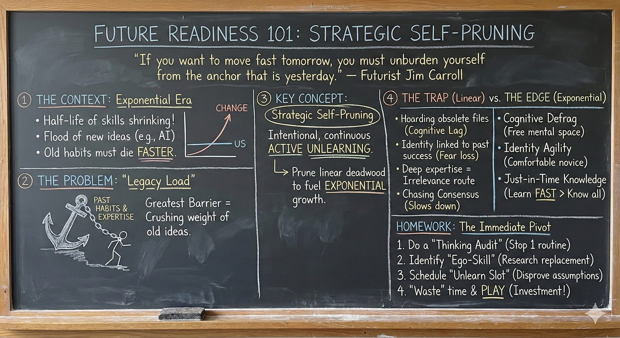 Here's what you need to achieve - the ability for what I call "Strategic Self-Pruning". It's an intentional, continuous, and often uncomfortable act of active unlearning. It is recognizing that in an exponential world, your current knowledge base is depreciating faster than ever before. This discipline requires you to ruthlessly identify and eliminate obsolete mental models, successful but outdated skills, and personal routines to create the necessary mindset to absorb new stuff.