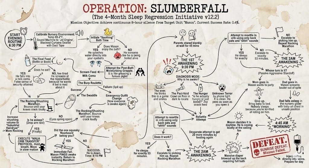 Or, Operation Slumberfall. I created this for my son and his wife, new parents with a 4 month old, asking it simply create, based on typical sleep patterns, what they are going through. They said it's pretty accurate.