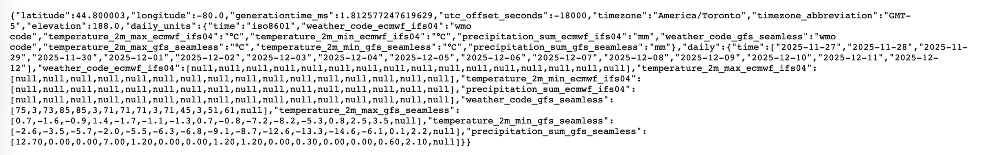 Let's bounce this back to the skills issue. Right now, I'm working at a furious pace to learn as much as I can about all the different aspects of AI, so I can determine what it means for my skill base. Last night, l I spent some leisure time by developing a new weather model. I have an AI that is going off and grabbing detailed weather insight from an online database for predictions 14 days out. I'm using what's called API's - application programming interfaces - to grab the data from a weather service.