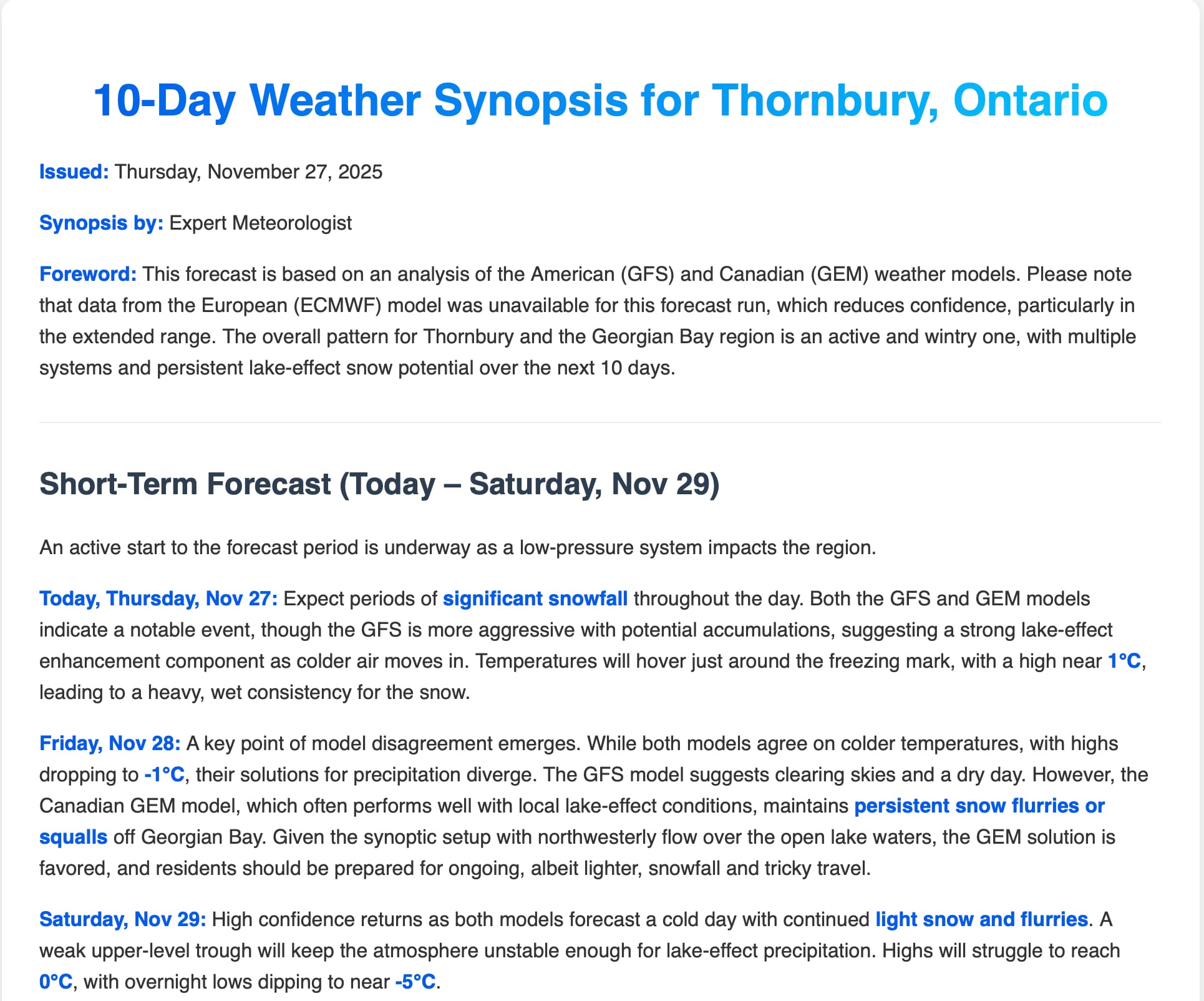 I then feed it to Google Gemini (my current AI of choice) via an API and "Python" code, to have it develop a detailed narrative weather forecast for two weeks out - as well as a cool little image that summarizes the text.