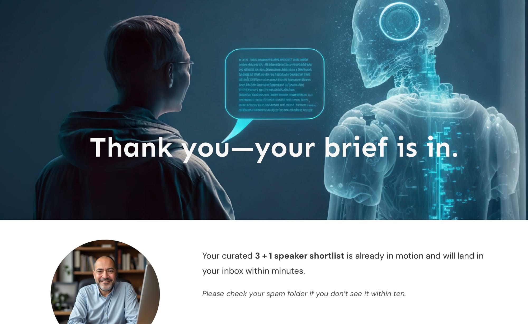 It's an AI speaker booking engine - give it a short brief, and in an instant, you'll get back a pretty detailed response with 3 speakers that match your requirements, plus one bonus idea.