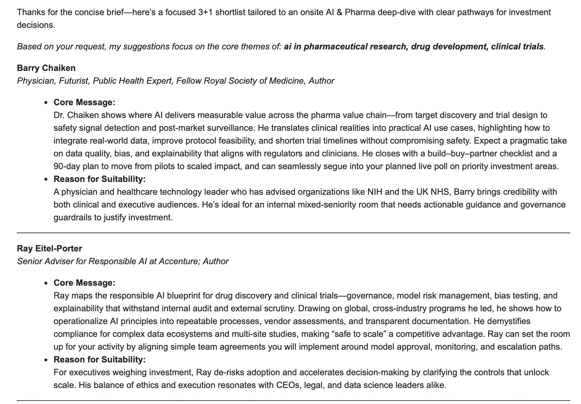 I did a quick test looking for an AI expert focused on the role of the technology in pharmaceutical and drug discovery, and I'm pretty astonished by the precision and depth of the response (although disappointed I wasn't on the list LOL!)