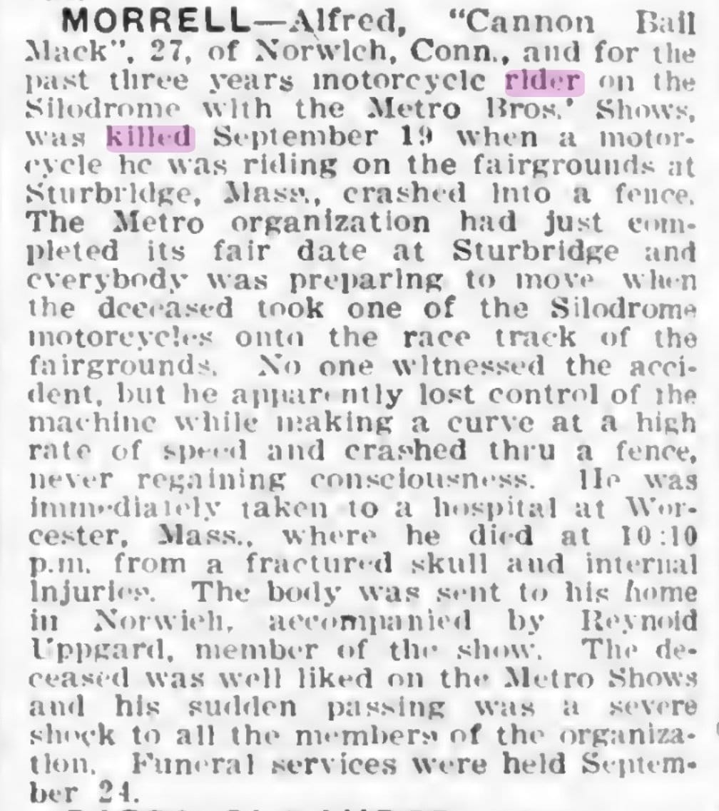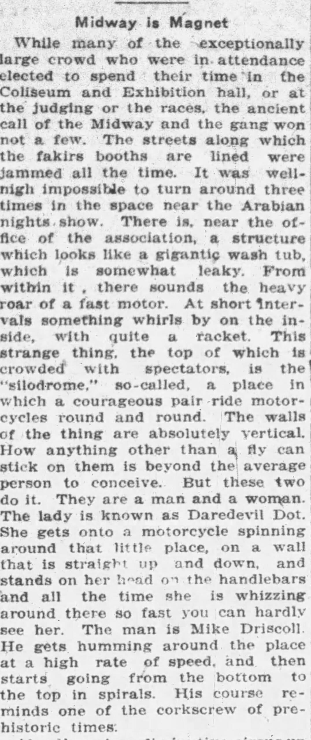 It's fascinating to think of just how interesting and odd a life he lived - this article puts into perspective the nature of the Midway Shows that he travelled in from town to town - as a rider in the Silodrome, also known as the ring of death.