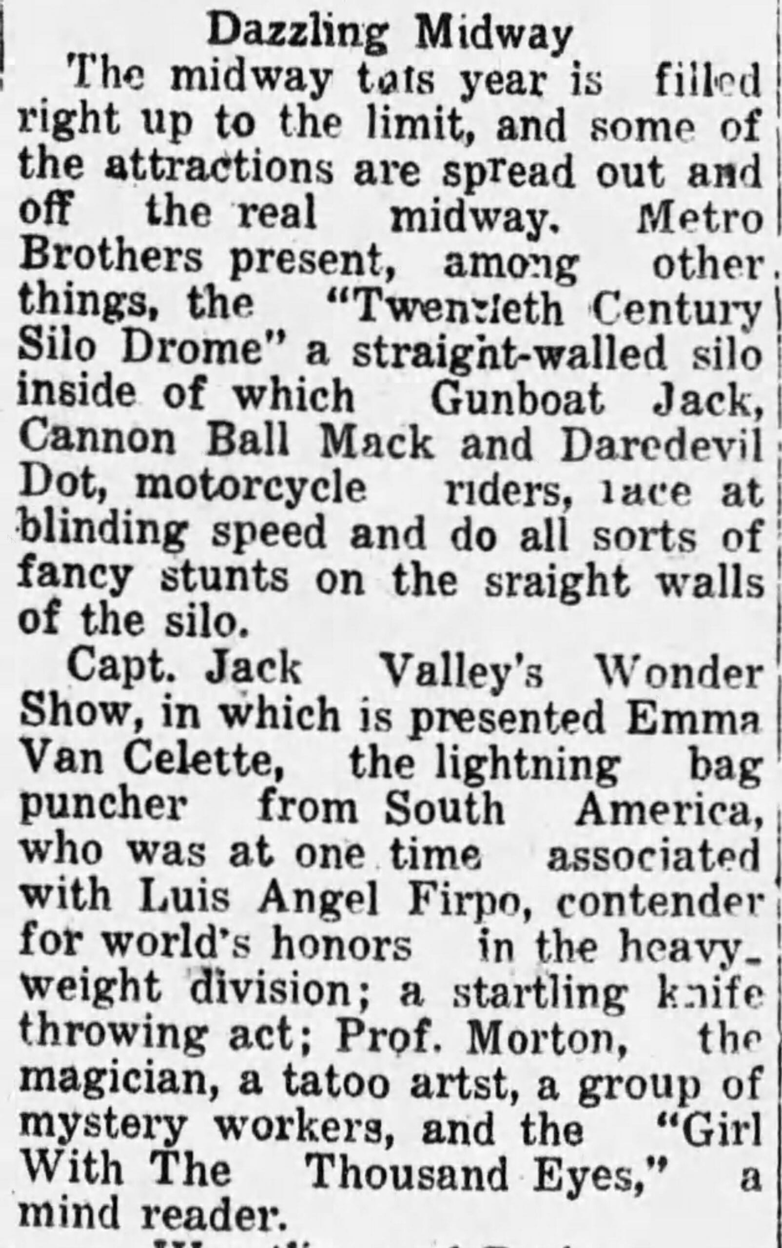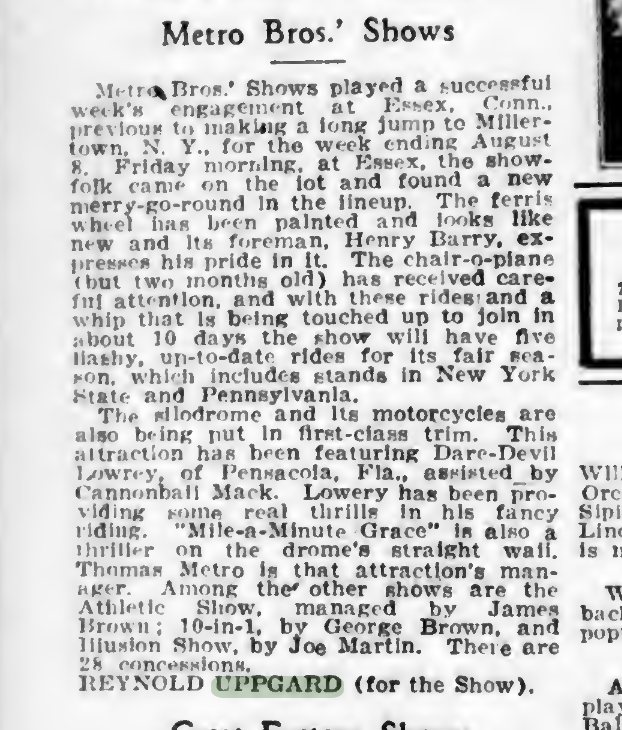 A notice of the midway show provides details on his final appearances. He hung out with Gunboat Jack and Daredevil Dot!
