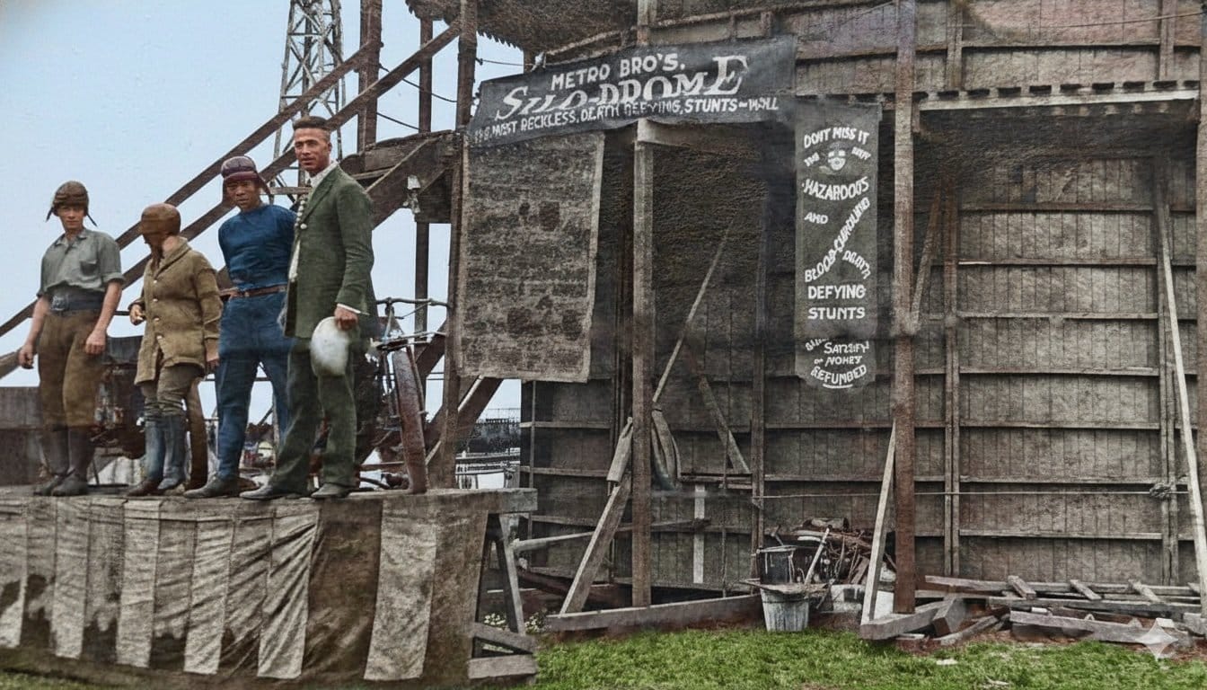 The "Wall of Death" stunt originated from early 1900s American boardtrack racing (motordromes), with the first vertical-walled "silodromes" appearing around 1915. The show involves riders circling a cylindrical wooden drum at speed, often without helmets, defying gravity as the audience watches from above. The spectacle became a global phenomenon, with Indian Scouts being the preferred machine due to their specific performance characteristics.