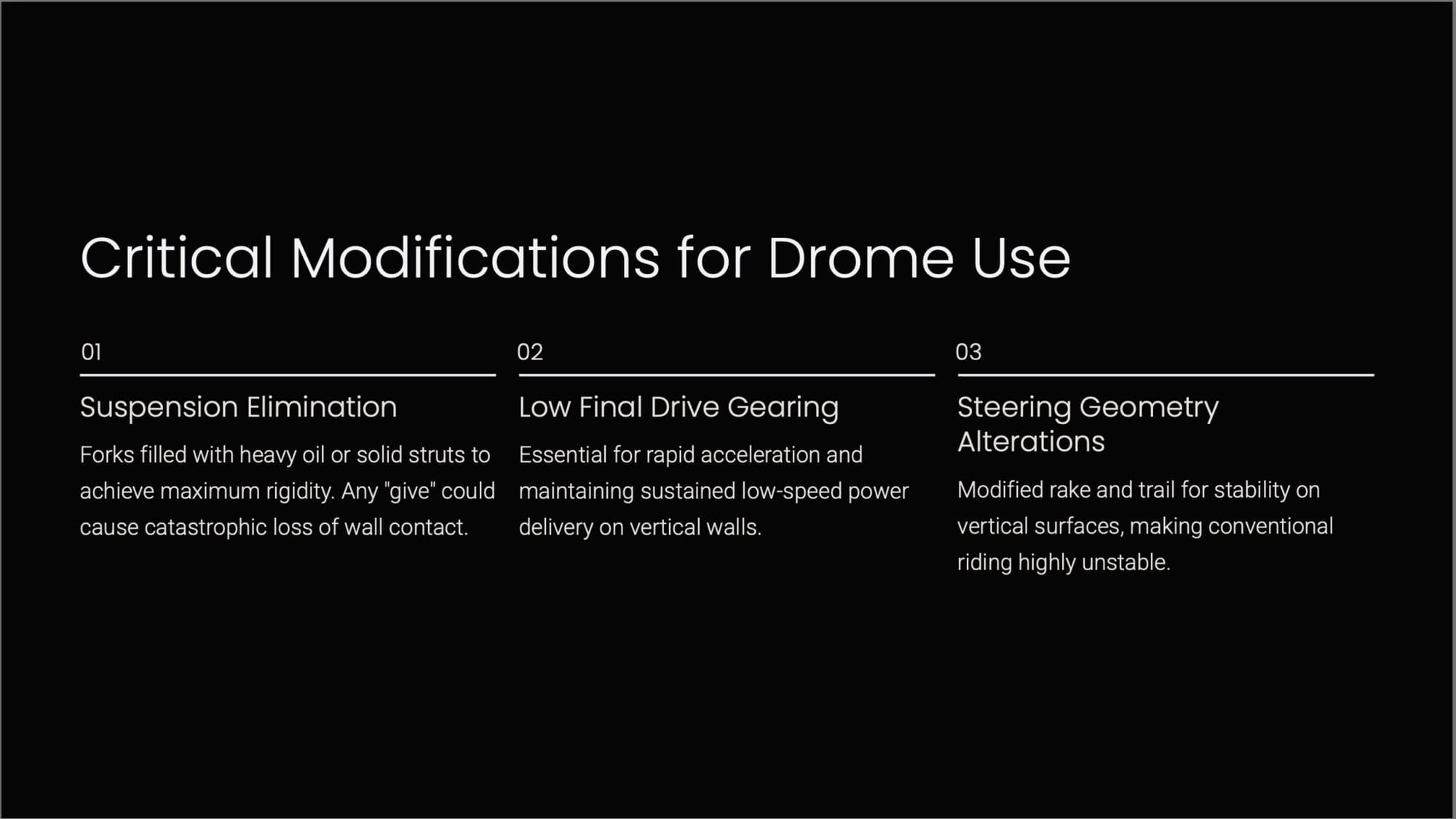 The key thing in this article is that the accident occurred because the front fork failed. The AI analysis above determined that the very modifications to the fork that were necessary to use the "wall of death" are what led to the accident itself!