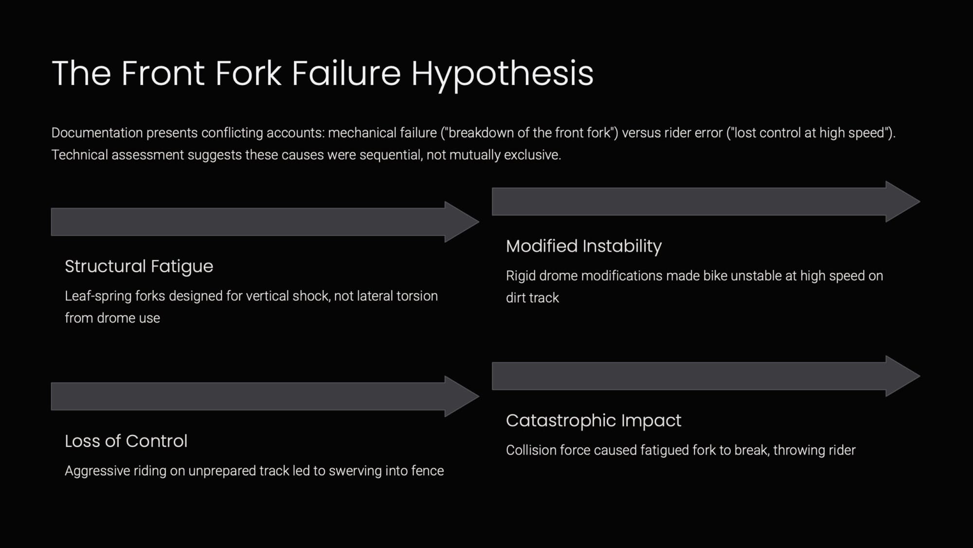 An interesting angle? The analysis concluded, from its research, that it was likely the modifications to the front fork were what caused his tragic accident: