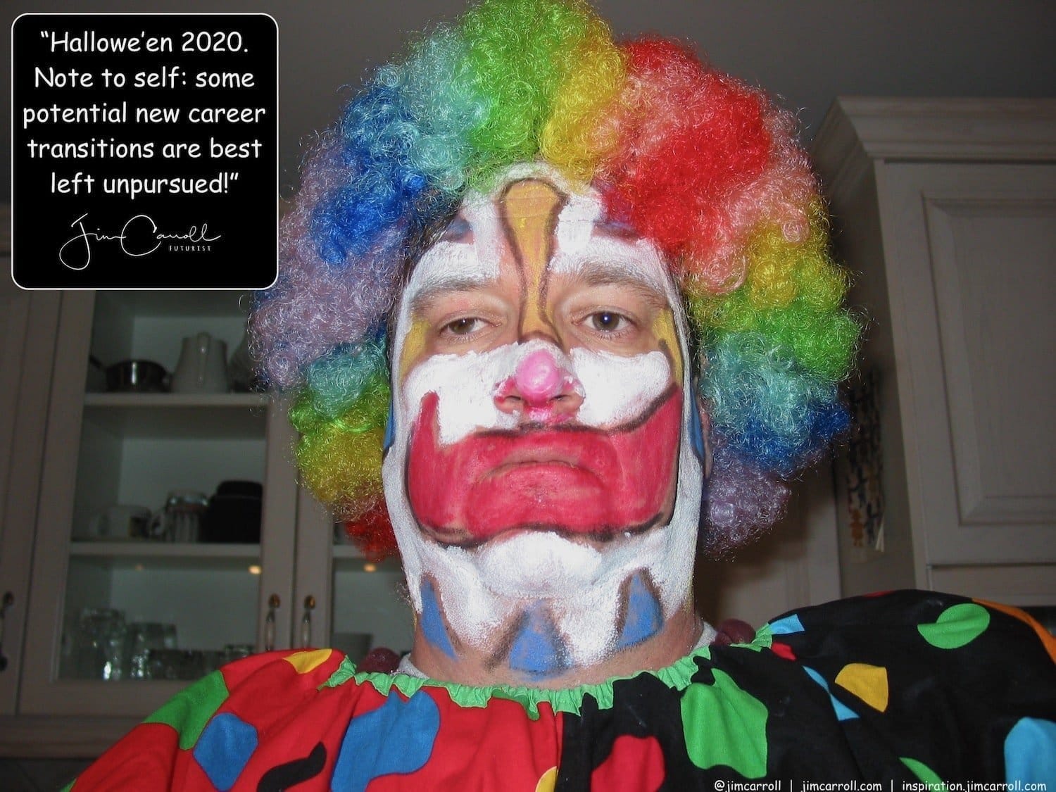 Here's what you need to be thinking about - the image of the fearful clown in my quote today is unsettling, isn't it? Clowns are meant to be joyful, but the AI image of me is not. Here's another fearful clown, also AI-generated. Timely!