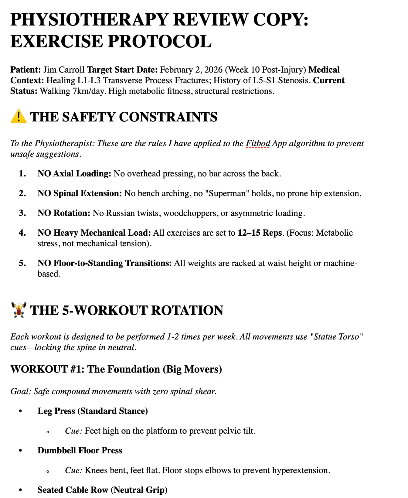 16. The "Pre-Flight" Gym Protocol. We created a strict "50% Load" governance model for my return to the gym. The goal was to test the chassis without breaking it.