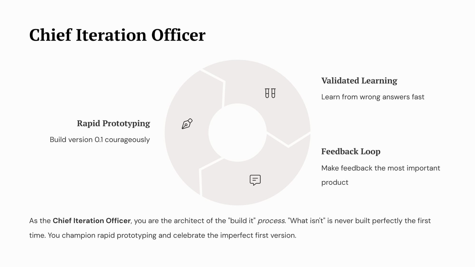 As the Chief Iteration Officer, you are the architect of the "build it" process. "What isn't" is never built perfectly the first time. You champion a culture of rapid prototyping and validated learning. You celebrate the version 0.1, knowing that the only way to the right answer is by courageously building the wrong ones fast and learning from them. You make the feedback loop the most important product.