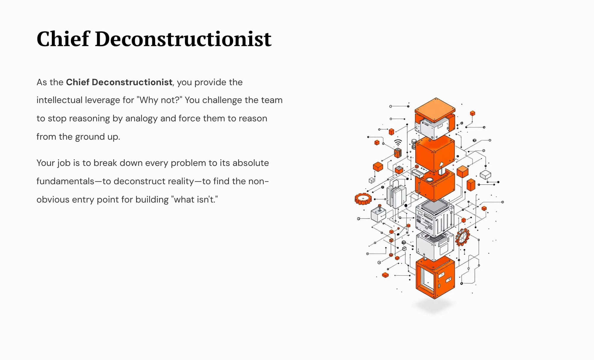 As the Chief Deconstructionist, you provide the intellectual leverage for "Why not?" You challenge the team to stop reasoning by analogy (the lazy "Why?") and force them to reason from the ground up. Your job is to break down every problem to its absolute fundamentals—to deconstruct reality—to find the non-obvious entry point for building "what isn't."