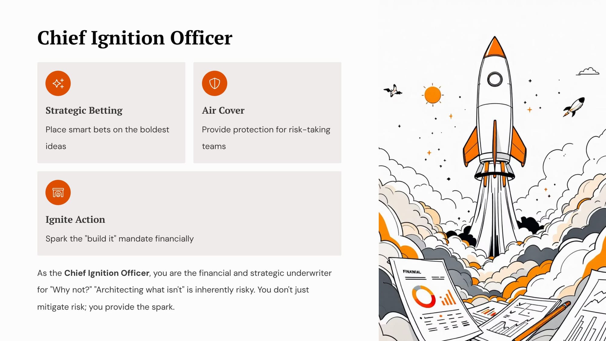 As the Chief Ignition Officer, you are the financial and strategic underwriter for "Why not?" "Architecting what isn't" is inherently risky. You don't just mitigate risk; you provide the spark. Your role is to place smart, strategic bets on the boldest ideas, provide the air cover for the teams building them, and ignite the "build it" mandate.