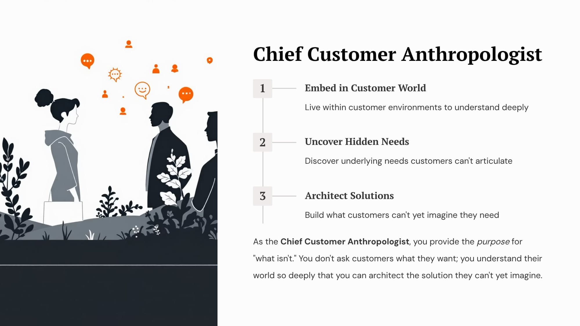 As the Chief Customer Anthropologist, you provide the purpose for "what isn't." You don't ask customers what they want; you embed your team in their world to understand their underlying needs so deeply that you can architect the solution they can't yet imagine. The "Why not?" is answered by a relentless, observational focus on the customer of tomorrow.