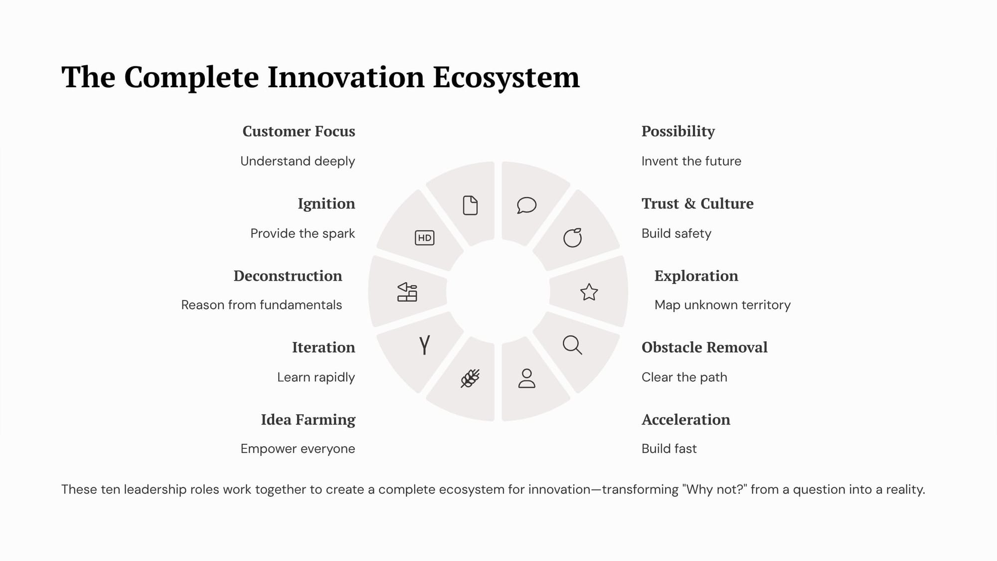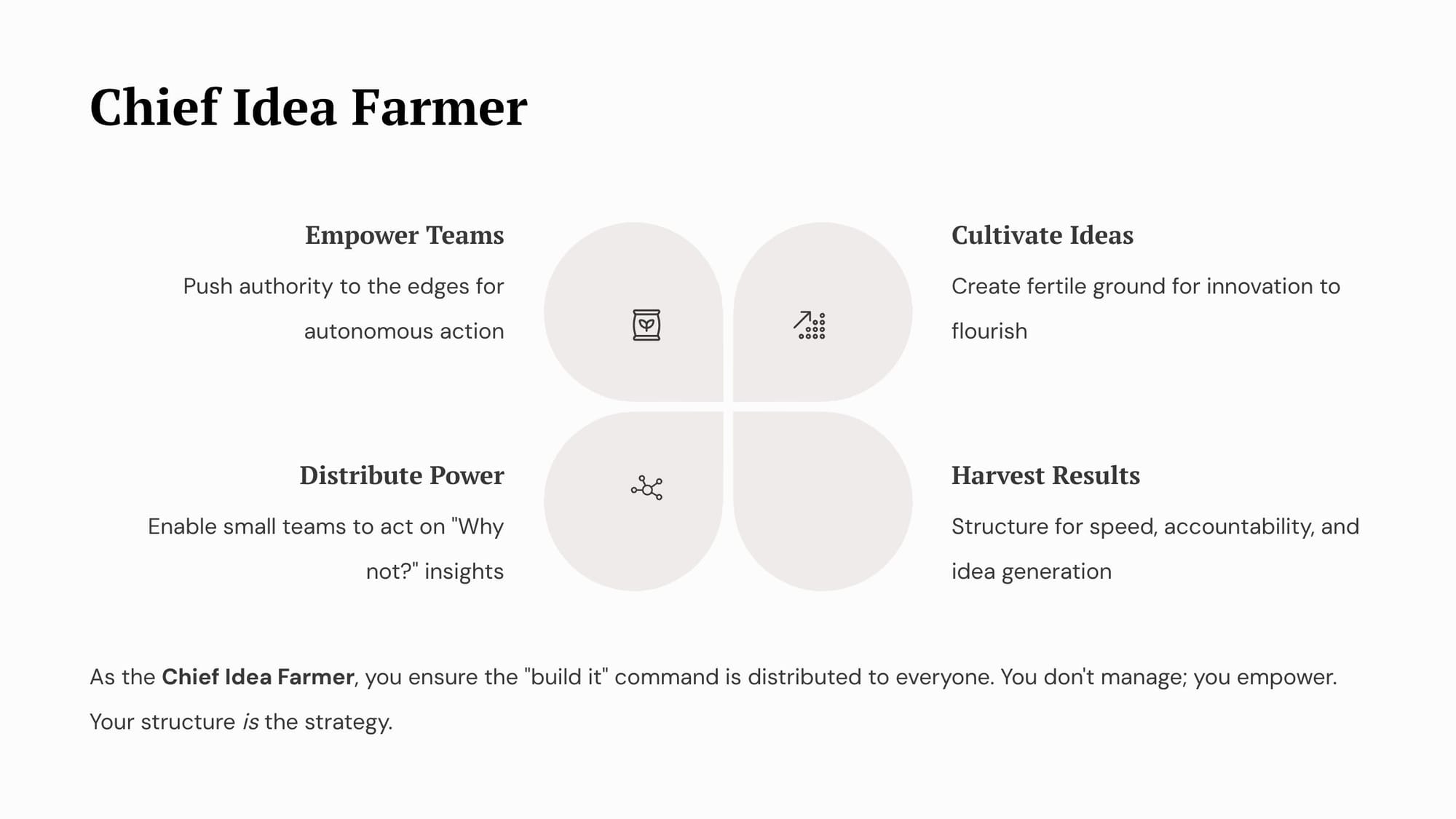 Your job is ideas, and your weapon is action. As the Chief Idea Farmer, you ensure the "build it" command is distributed to everyone. You don't manage; you empower. You push authority to the edges—cultivating the fertile ground where small, autonomous teams can grow and act on their own "Why not?" insights. Your structure is the strategy, designed for speed, accountability, and a harvest of ideas, not top-down control.