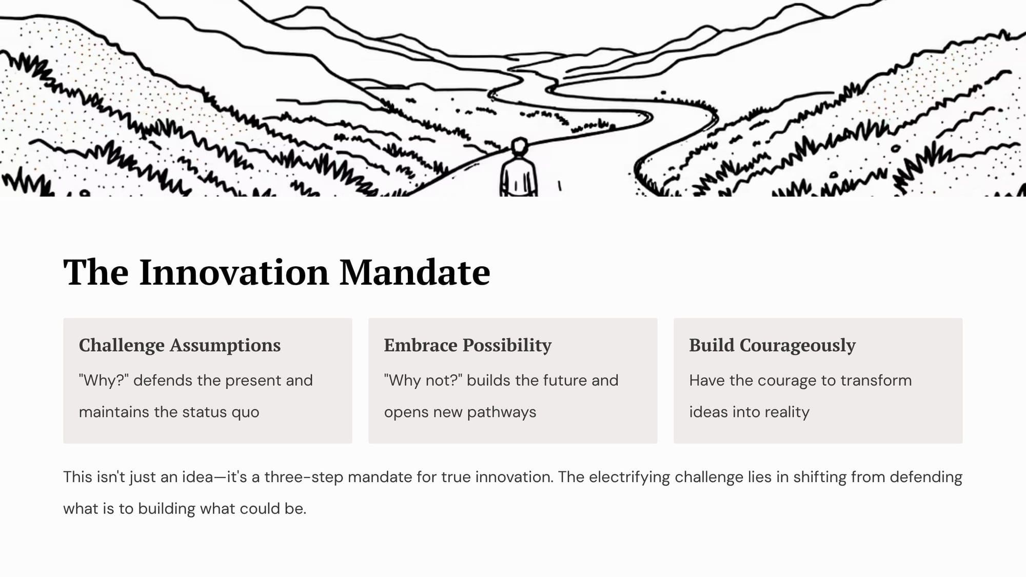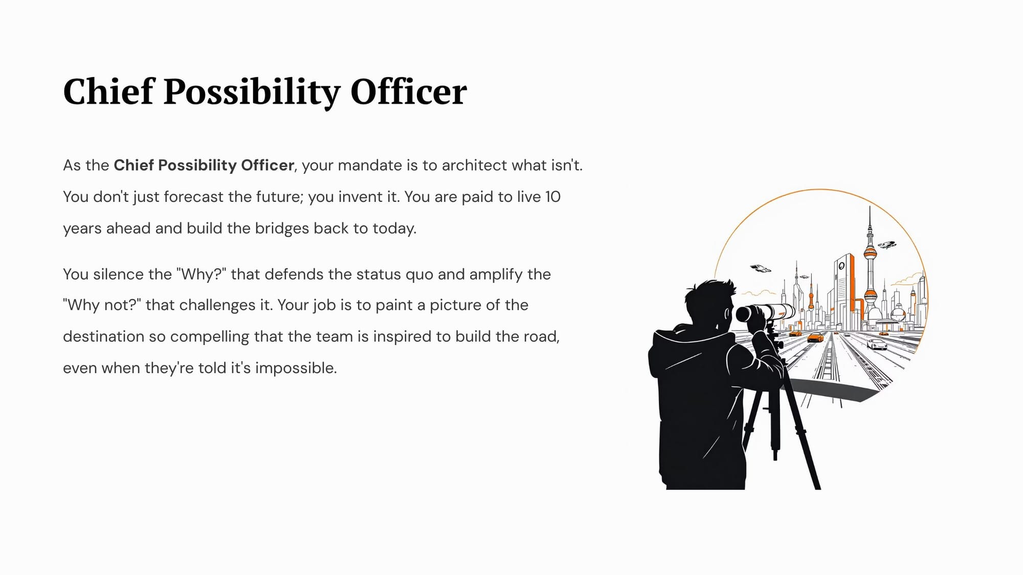 As the Chief Possibility Officer, your mandate is to architect what isn't. You don't just forecast the future; you invent it. You are paid to live 10 years ahead and build the bridges back to today. You silence the "Why?" that defends the status quo and amplify the "Why not?" that challenges it. Your job is to paint a picture of the destination so compelling that the team is inspired to build the road, even when they're told it's impossible.