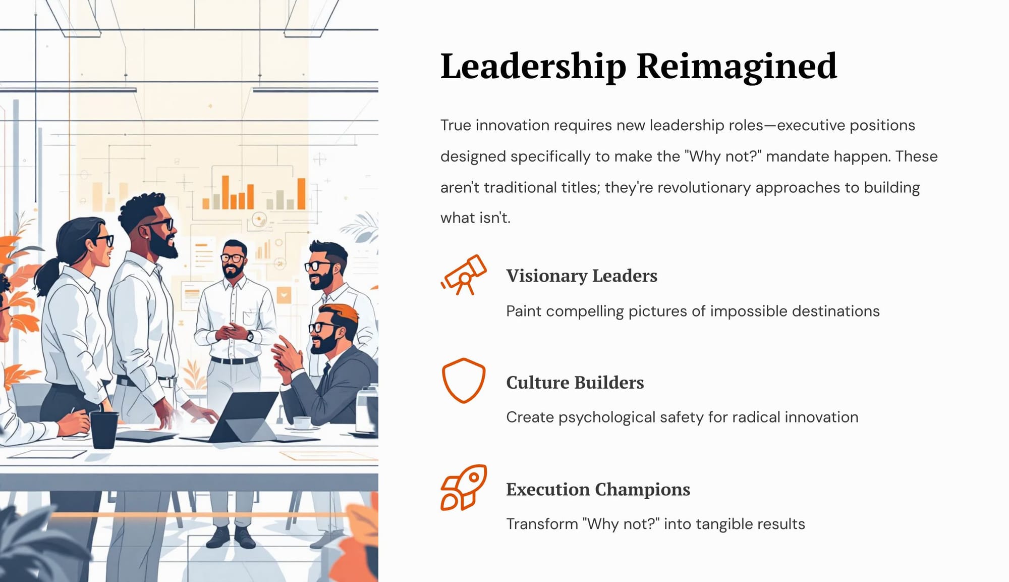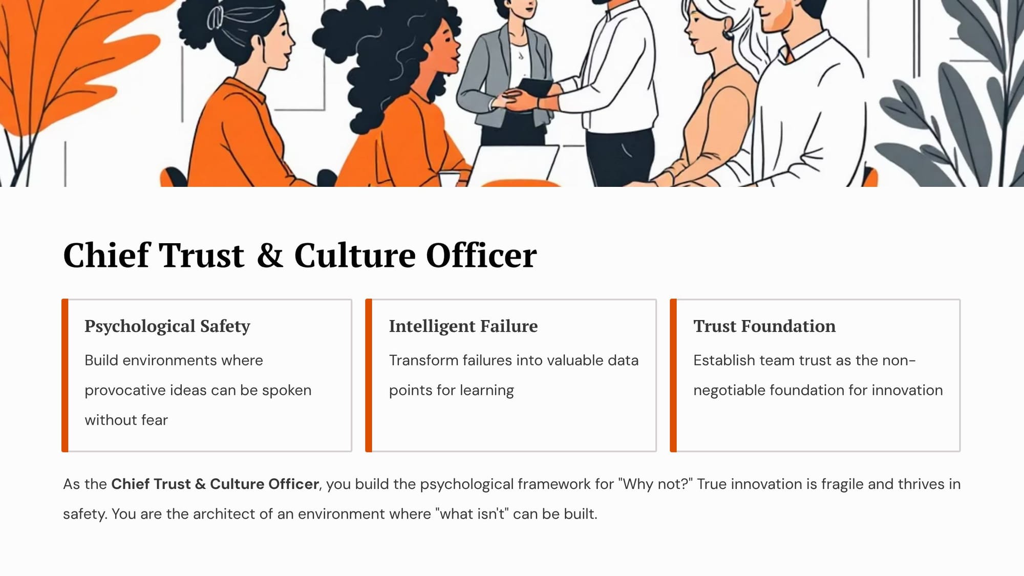 As the Chief Trust & Culture Officer, you build the psychological framework for "Why not?" True innovation is fragile and thrives in safety. You are the architect of an environment where provocative ideas can be spoken without fear, where intelligent failure is just data, and where the team's trust in each other is the non-negotiable foundation upon which "what isn't" can be built.