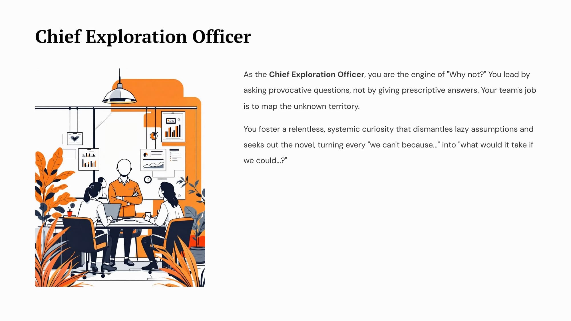 As the Chief Exploration Officer, you are the engine of "Why not?" You lead by asking provocative questions, not by giving prescriptive answers. Your team's job is to map the unknown territory. You foster a relentless, systemic curiosity that dismantles lazy assumptions and seeks out the novel, turning every "we can't because..." into "what would it take if we could...?"