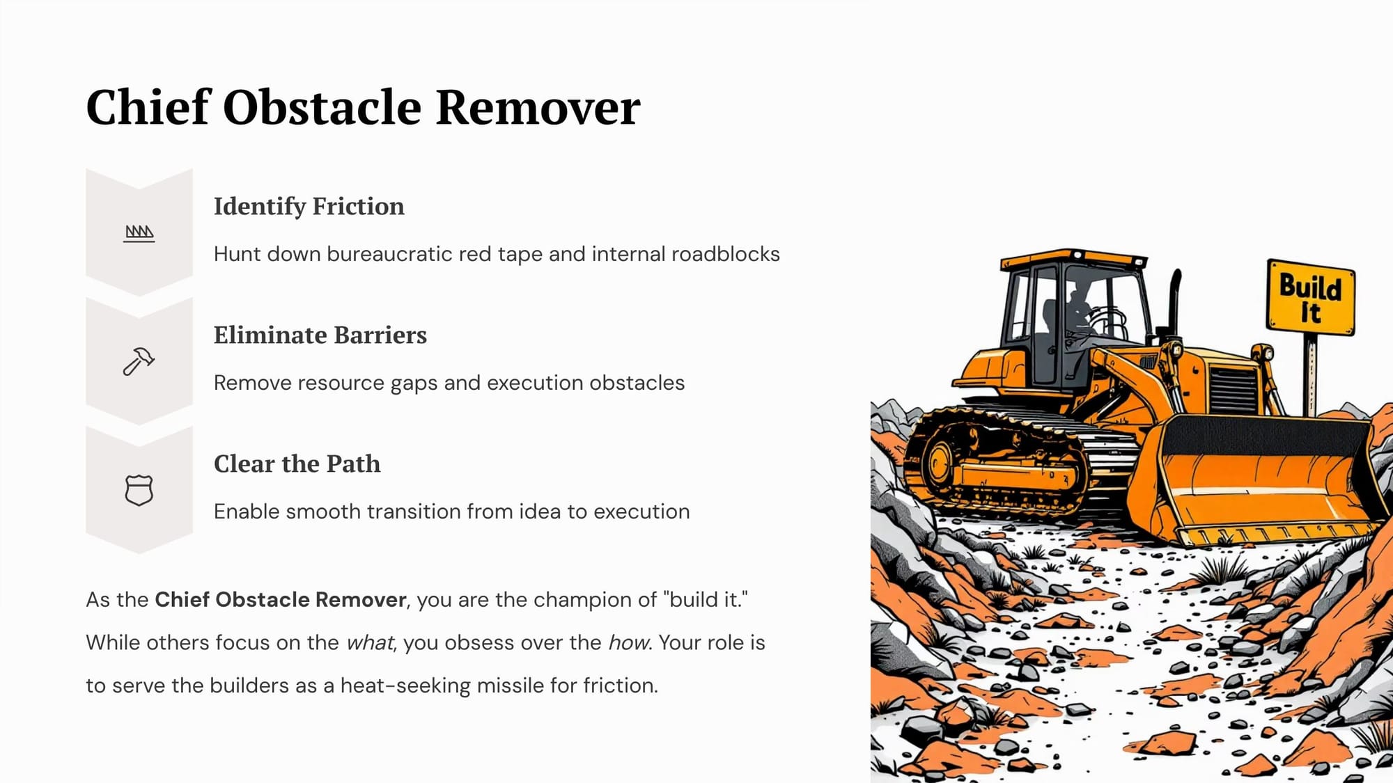 I LOVE THIS TITLE! As the Chief Obstacle Remover, you are the champion of "build it." While others focus on the what, you obsess over the how. Your role is to serve the builders. You are a heat-seeking missile for friction, relentlessly hunting down and eliminating any bureaucratic red tape, resource gap, or internal roadblock that stands between a "Why not?" idea and its execution. You clear the path.
