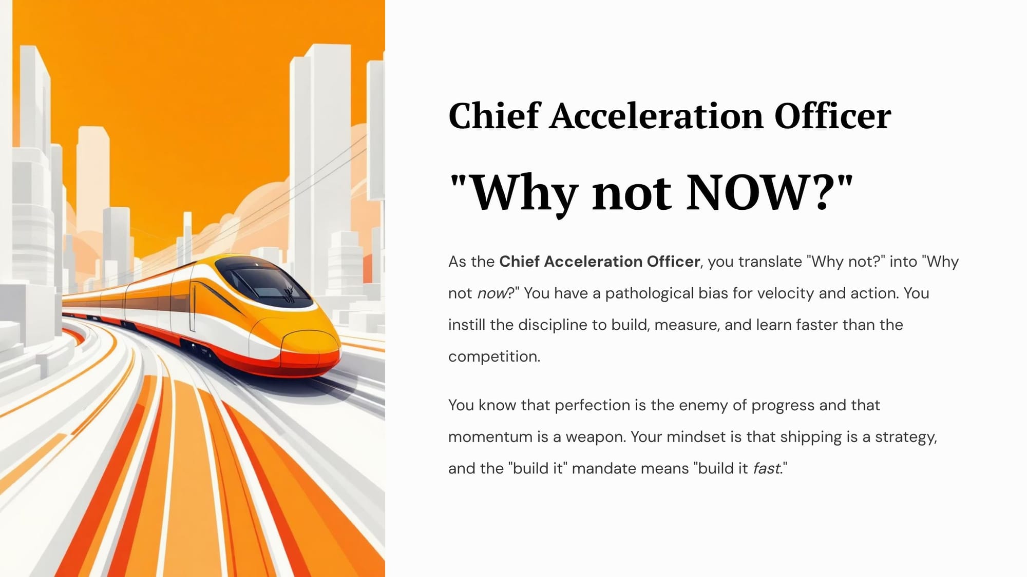 As the Chief Acceleration Officer, you translate "Why not?" into "Why not now?" You have a pathological bias for velocity and action. You instill the discipline to build, measure, and learn faster than the competition. You know that perfection is the enemy of progress and that momentum is a weapon. Your mindset is that shipping is a strategy, and the "build it" mandate means "build it fast."